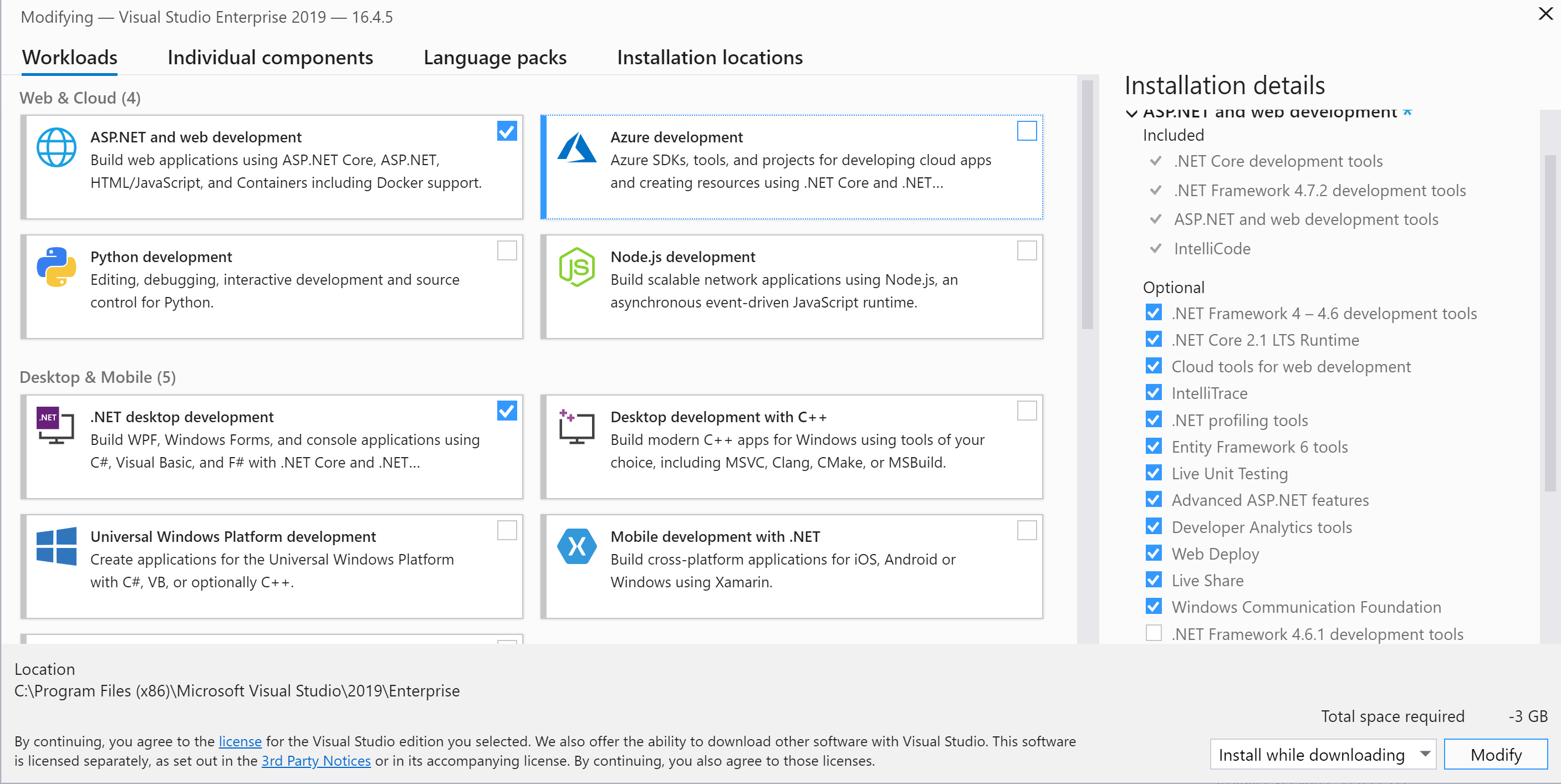 - After finishing the download, double click on the downloaded software to start installation. Make sure you choose .Net desktop development, Universal Widows Platform development, and ASP.Net and web development, and make sure to select Microsoft Windows Communication Foundation under Installation Details (see screen shot below).