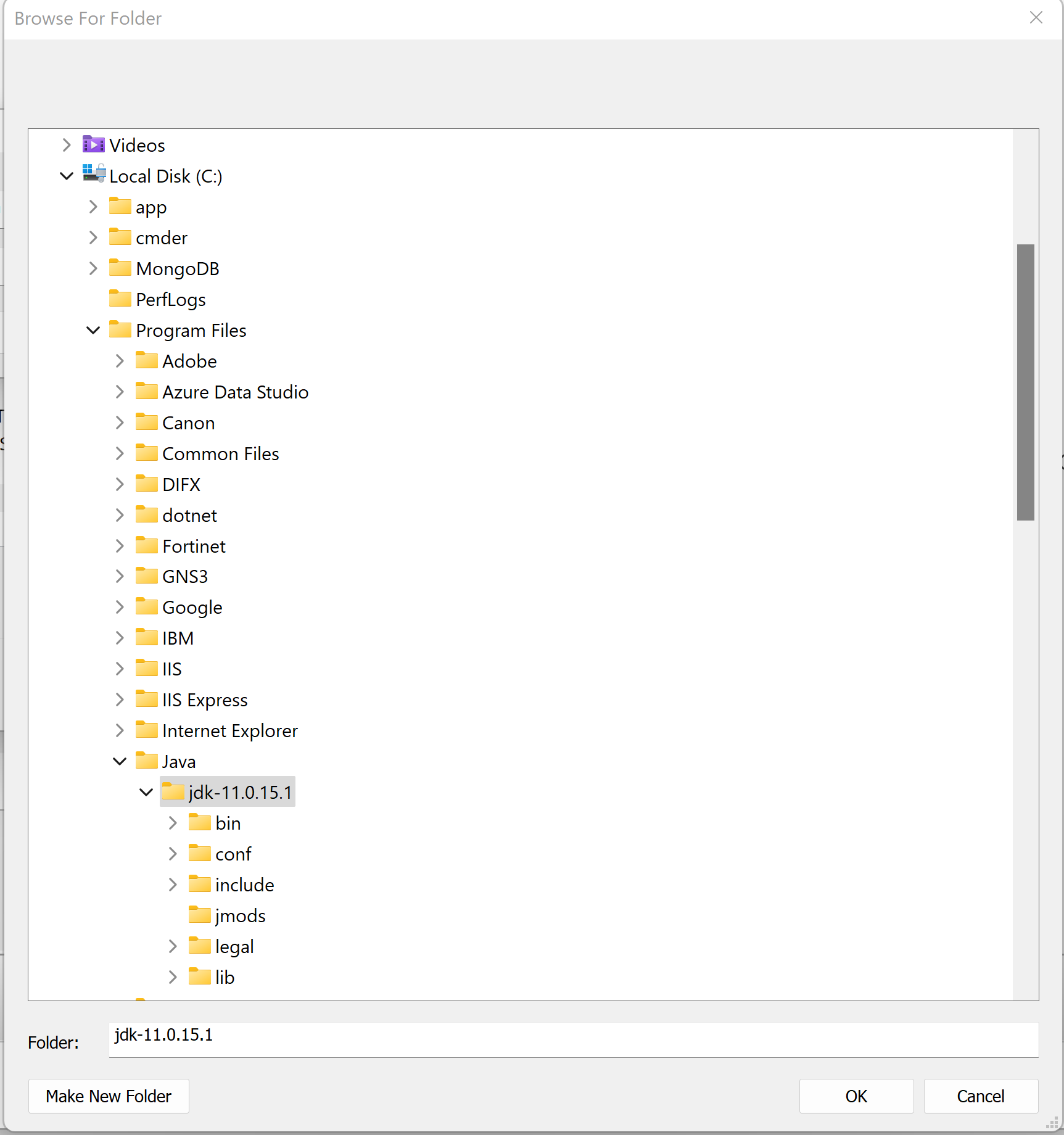 - For example, for JDK 11, you would navigate first to Local Disk (C:), then "Program Files", then "Java", and finally select the folder jdk1-11.x.x.x that JDK 11 was installed (Note that the folder should contain bin, lib, conf, etc. as sub folders.)