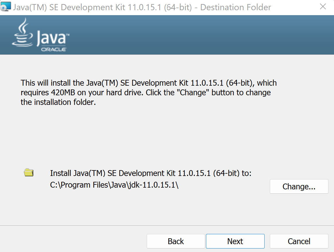 - JDK SE Version 11 Installation: Double click on the downloaded file and follow the installation wizard to install. First, choose your installation folder.