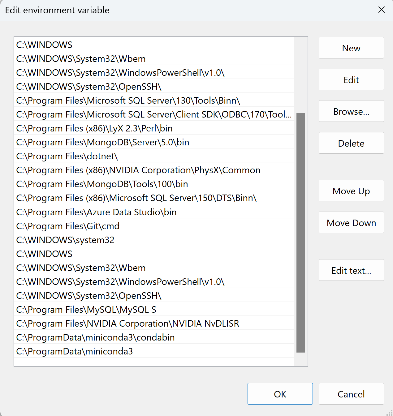 Note 1: Make sure you follow the guideline and put miniconda binary onto the system path c:\ProgramData\miniconda3\condabin (see below).
